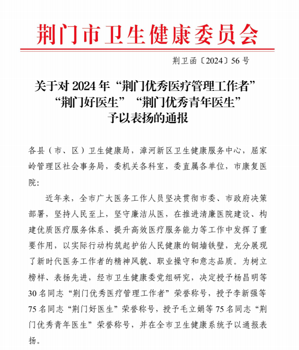 近日,荊門市衛(wèi)生健康委員會印發(fā)了《關(guān)于對 2024 年“荊門優(yōu)秀醫(yī)療管理工作者”“荊門好醫(yī)生”“荊門優(yōu)秀青年醫(yī)生”》予以表揚(yáng)的通報。