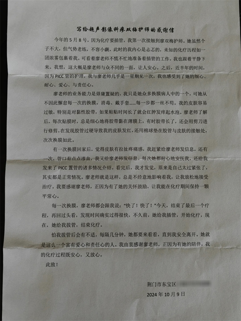 5月8日化療開始,超聲影像科護師廖雙梅負責為李女士置放PICC導管(一種經(jīng)外周靜脈穿刺至中心靜脈的置管)。“我與廖老師幾乎每周見一次,在她這里我再次感受到了醫(yī)護人員的細心和耐心。”李女士在另一封信上寫道。細心的廖雙梅得知她皮膚過敏,就將膠管用薄膜與皮膚隔開,“每次換膜,膠管長了,她都要用剪刀修剪,膠管硬了,她就用棉球墊在皮膚上?!睋Q膜回家后,廖雙梅還通過信息安撫李女士,給她轉(zhuǎn)發(fā)PICC導管科普知識。“正因為有了她的關(guān)懷,讓我在化療期間始終保持著樂觀的心態(tài)。”